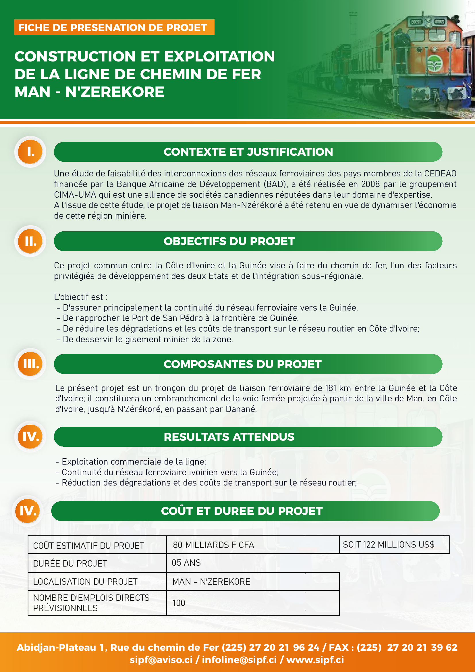 Le présent projet est un tronçon du projet de liaison ferroviaire de 181 km entre la Guinée et la Côte d'Ivoire; il constituera un embranchement de la voie ferrée projetée à partir de la ville de Man. en Côte d'Ivoire, jusqu'à N'Zérékoré, en passant par Danané
